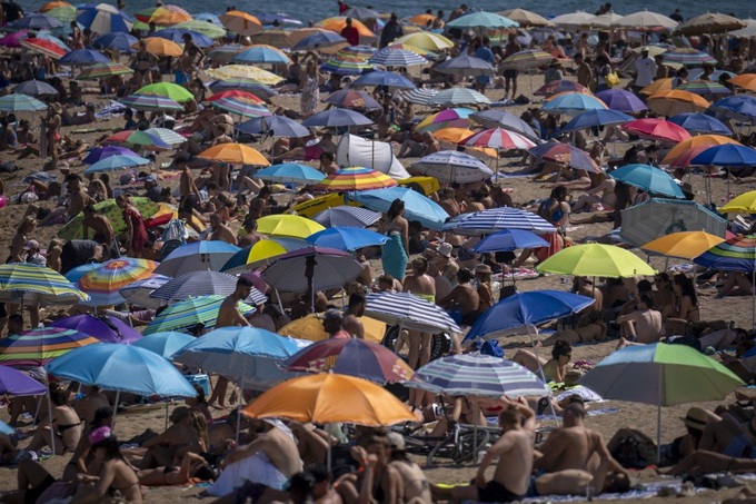 Bãi biển chật kín người ở Barcelona, Tây Ban Nha giữa nắng nóng kỷ lục (Ảnh: AP).