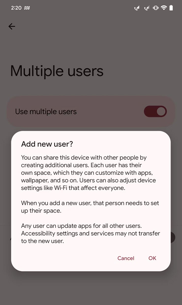 Tính năng nhiều người dùng cũng có một tùy chọn để tùy chỉnh các cuộc gọi điện thoại và cài đặt SMS. Bạn có thể chọn cho phép cuộc gọi điện thoại và thông báo SMS cho những người dùng cụ thể. Ngoài ra, bạn có thể cài đặt ứng dụng trực tiếp từ những người dùng khác thay vì tải xuống lại, ứng dụng sẽ được cập nhật cho mọi người dùng nếu một người dùng khác trên thiết bị đã thực hiện việc này.