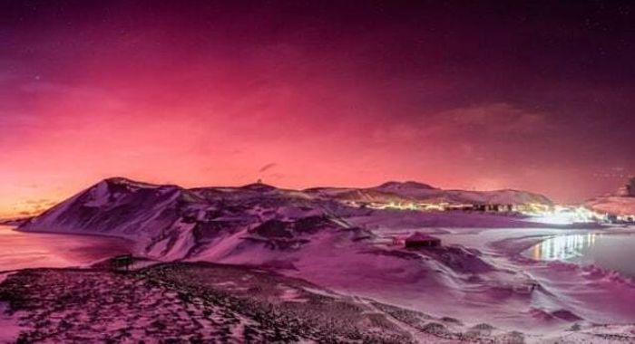 Những bức ảnh từ trạm nghiên cứu Scott Base của viện nghiên cứu Nam Cực, New Zealand cho thấy cảnh tượng bầu trời ngập trong sắc hồng và tím khác lạ chưa từng có.