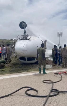 Hình ảnh từ hiện trường cho thấy những cột khói đen bốc lên từ máy bay khi các nhân viên cứu hỏa chiến đấu để dập tắt ngọn lửa. Đây là một chiếc Fokker-50 do hãng hàng không nội địa của Somalia – Jubba Airways – vận hành. Có thể nhìn thấy các mảnh vỡ của chiếc máy bay rải rác trên đường băng.