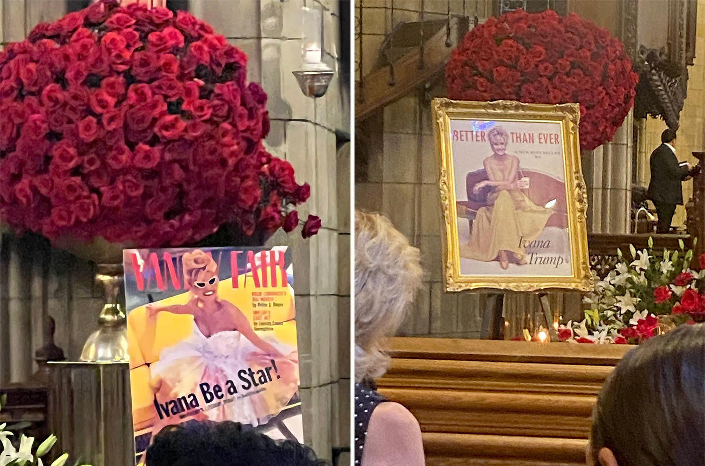 Trong đó có một bức là hình ảnh bà Ivana trên trang bìa tạp chí Vanity Fair năm 1992 cùng dòng chữ "Ivana Be A Star". Tên của Hillary Clinton cũng được in trên trang bìa năm 1992. Tuy nhiên, nó đã bị xóa khỏi phiên bản trưng bày trong lễ truy điệu Ivana. Bức ảnh thứ hai được đóng khung dường như cũng là một trang bìa tạp chí cũ kèm tiêu đề "Better Than Ever... Ivana Trump".