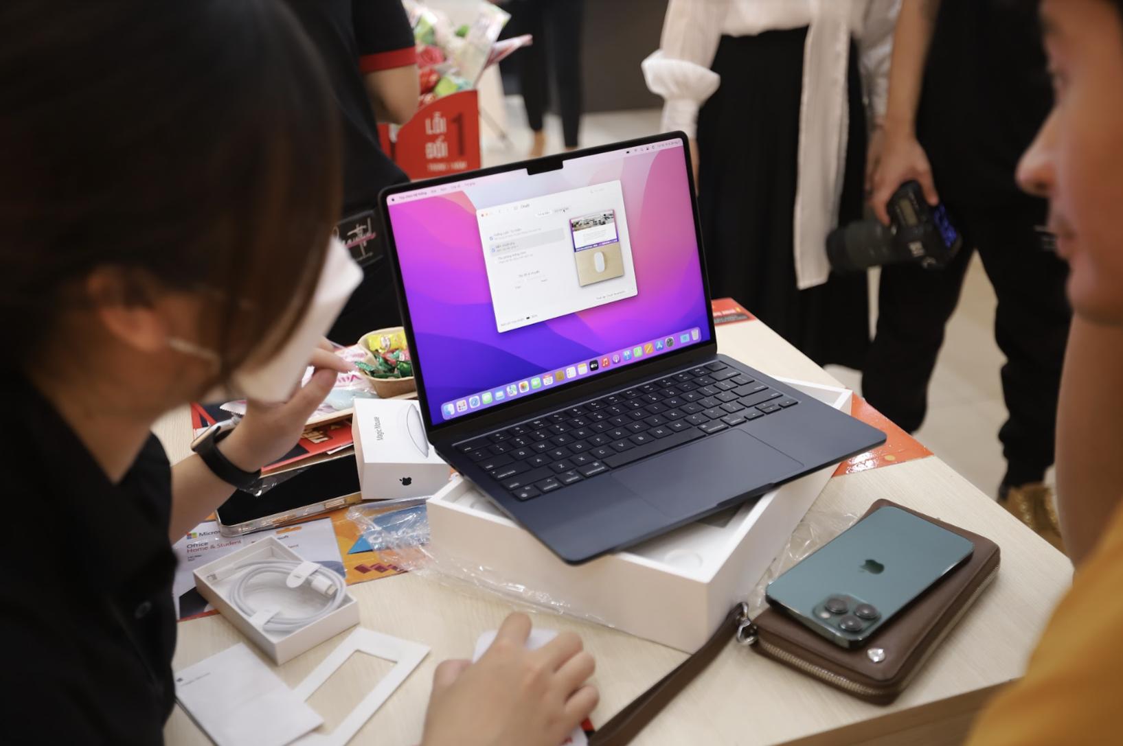 Trước đó, từ ngày 18.7, FPT Shop đã nhận đăng ký trước MacBook Air M2 chính hãng. Tất cả khách hàng đã đăng ký sẽ được ưu tiên nhận máy sớm và nhận thêm bộ quà với tổng trị giá lên đến 3 triệu đồng.Vào trưa 28.7, FPT Shop đã chính thức lên kệ MacBook Air M2 chính hãng tại cửa hàng số 202 Nguyễn Thị Minh Khai, quận 3, TP.HCM. Đây cũng là chuỗi cửa hàng đầu tiên mở bán siêu phẩm máy tính mới nhất của Apple tại thị trường Việt Nam. Ngoài ra, FPT Shop còn dành tặng 20 khách hàng đến nhận máy sớm nhất phiếu mua hàng trị giá 2,5 triệu đồng dùng để mua các sản phẩm Apple Magic Mouse 2, AirPods 2, AirPods 3, AirPods Pro.
