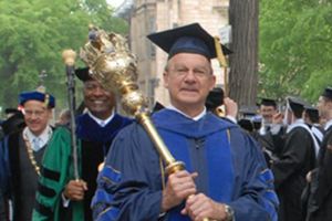 Trên trang chủ của trường Đại học Yale (Mỹ), giới thiệu về truyền thống mang quyền trượng của Hiệu trưởng. Theo đó, nghi thức này bắt đầu có từ năm 1904 và đã được duy trì trong suốt chiều dài lịch sử hơn 100 năm qua của nhà trường.Mỗi năm, Hiệu trưởng được được giao nhiệm vụ mang chiếc quyền trượng mạ vàng trong lễ tốt nghiệp, dẫn đầu đoàn rước từ Woodbridge Hall đến Old Campus. Từ năm 2012 đến nay, nhiệm vụ này được giao cho ông Jon Butler, cựu Hiệu trưởng của trường sau Đại học (Graduate School) đảm nhận.
