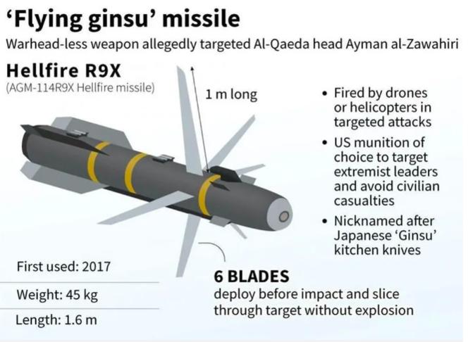 Vụ ám sát thủ lĩnh al-Qaeda Ayman al-Zawahiri cho thấy Mỹ đang sở hữu và sử dụng một loại tên lửa ám sát rất lợi hại - đó là loại tên lửa Ninja xé nát mục tiêu bằng các lưỡi dao sắc bén, không cần đến thuốc nổ.