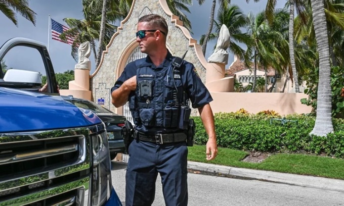 Nhân viên thực thi pháp luật địa phương canh gác trước dinh thự của cựu tổng thống Donald Trump tại khu nghỉ dưỡng Mar-a-Lago ở Palm Beach, Florida, hôm 9/8. Ảnh: AFP.