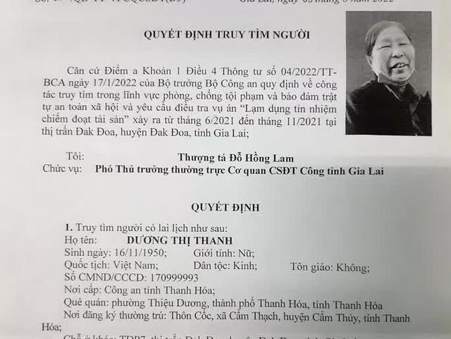 Ngày 13-8, Cơ quan Cảnh sát điều tra - Công an tỉnh Gia Lai đã phát đi thông báo truy tìm đối tượng Dương Thị Thanh (72 tuổi; trú huyện Cẩm Thủy, tỉnh Thanh Hóa) để điều tra vụ án "lạm dụng tín nhiệm, chiếm đoạt tài sản".