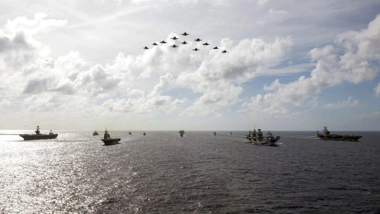 Hải quân các nước, Mỹ, Anh, Nhật Bản diễn tập trong vùng Biển Đông ngày 03/10/2021, sau khi Trung Quốc thể hiện sức mạnh quân sự đe dọa Đài Loan. Ảnh do Hải quân Mỹ cung cấp. AP - Michael Jarmiolowski