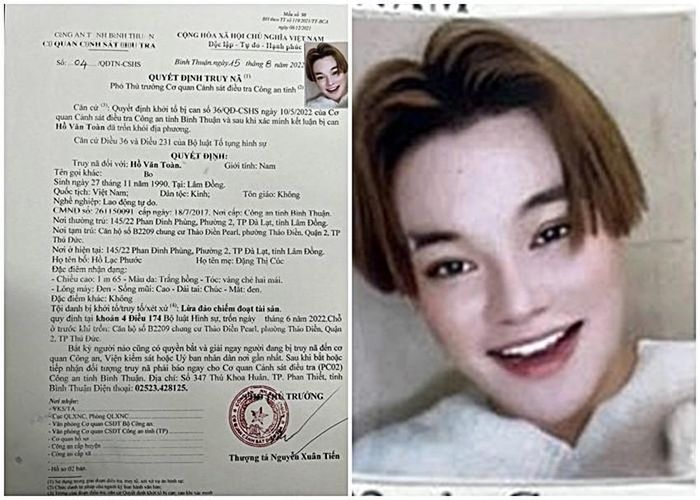 Theo quyết định truy nã, Hồ Văn Toàn tên gọi khác là Bo, thường trú phường 2, TP Đà Lạt (Lâm Đồng); tạm trú chung cư Thảo Điền Pearl, phường Thảo Điền, TP Thủ Đức đã bỏ trốn khỏi địa phương sau khi bị khởi tố về hành vi lừa đảo chiếm đoạt tài sản.