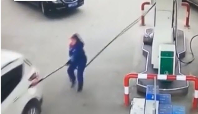 Những tưởng xăng đã được bơm xong, lúc này chiếc ô tô trắng ở bên trái đã đạp ga phóng đi. Tuy nhiên, thực tế vòi bơm xăng vẫn đang cắm ở bình. Phát hiện ra sự việc, nữ nhân viên trạm xăng đã chạy theo, cố gắng rút vòi bơm ra nhưng do bị vướng vào dây nên cô này cũng bị quật ngã xuống đất.
