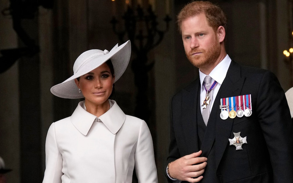 Hoàng tử Harry và vợ Meghan Markle trong lần về Anh hồi tháng 6. Ảnh: AP