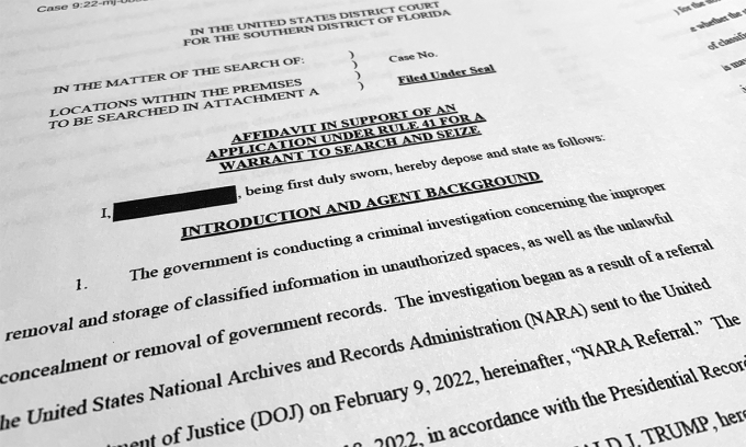 Phần mở đầu tờ trình xin lệnh khám dinh thự Mar-a-Lago của cựu tổng thống Mỹ Donald Trump được công bố ngày 26/8. Ảnh: AP.