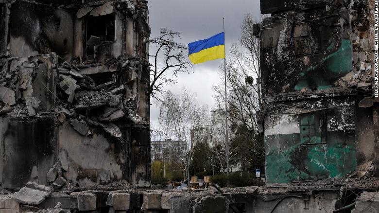 Quốc kỳ Ukraine tung bay trong một khu dân cư bị hư hại ở thành phố Borodianka, phía tây bắc thủ đô Kiev.
