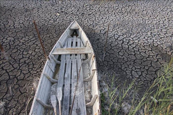 Hồ nước Velence gần Pakozd, Hungary khô cạn do nắng nóng và hạn hán ngày 18/8/2022. Ảnh: THX/TTXVN