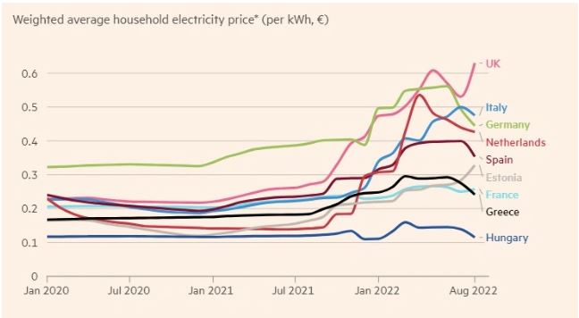 Giá điện ở Anh tăng vọt trong tháng 8 khi nhiều nước châu Âu giảm nhẹ (Đơn vị: bảng Anh/kWh). Đồ họa: Financial Times.