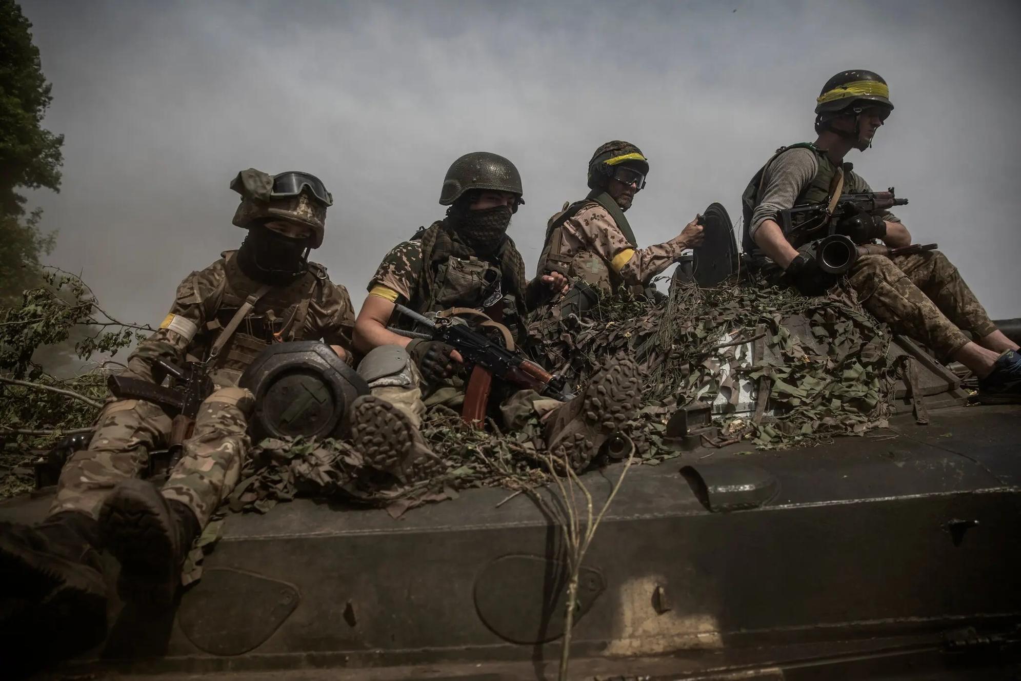 Binh sĩ Ukraine ngồi trên xe bọc thép. Ảnh IT