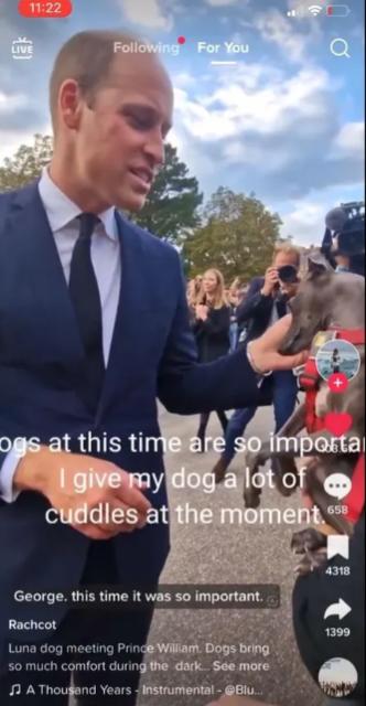 Sau khi biết tên con chó của người dân là Luna. Hoàng tử William chia sẻ về việc những chú chó là niềm an ủi với ông trong thời điểm này. "Tôi đã ôm chú chó ở nhà rất nhiều vào lúc này".