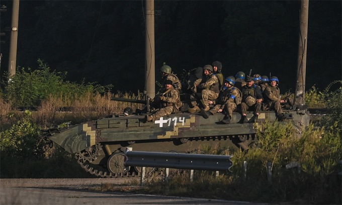 Binh sĩ Ukraine di chuyển trên thiết giáp ở tỉnh Kharkov ngày 12/9. Ảnh: AFP.