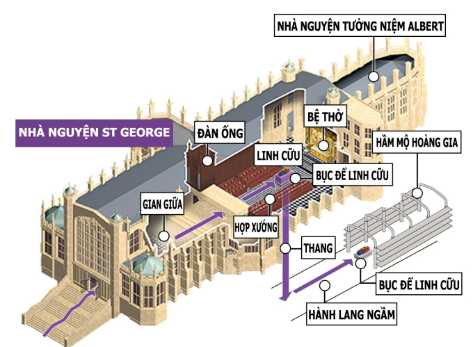 Sau tang lễ, linh cữu Nữ hoàng Elizabeth II sẽ được chuyển xuống hầm mộ trong Nhà nguyện St George, nơi 25 thành viên Hoàng gia Anh đang an nghỉ.