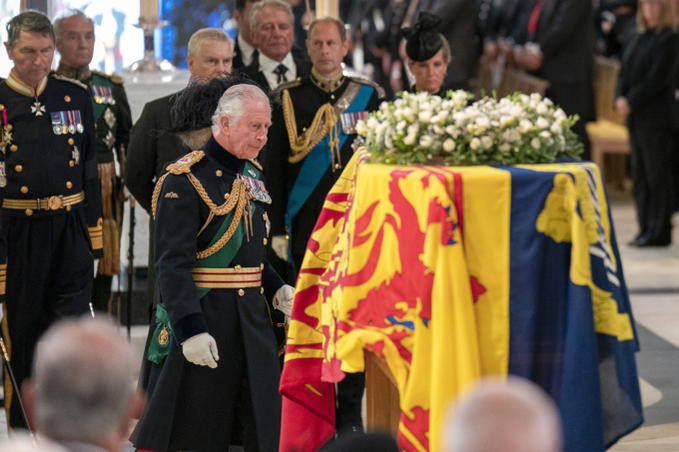 Vua Charles III (trái) đứng cạnh quan tài Nữ hoàng Elizabeth II trong nhà thờ St.Giles ở Edinburgh, Scotland, hôm 12/9. Ảnh: AFP.