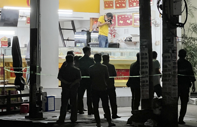 Cảnh sát khám nghiệm hiện trường vụ cướp tiệm vàng, tối 20/9. Ảnh: Phước Tuấn
