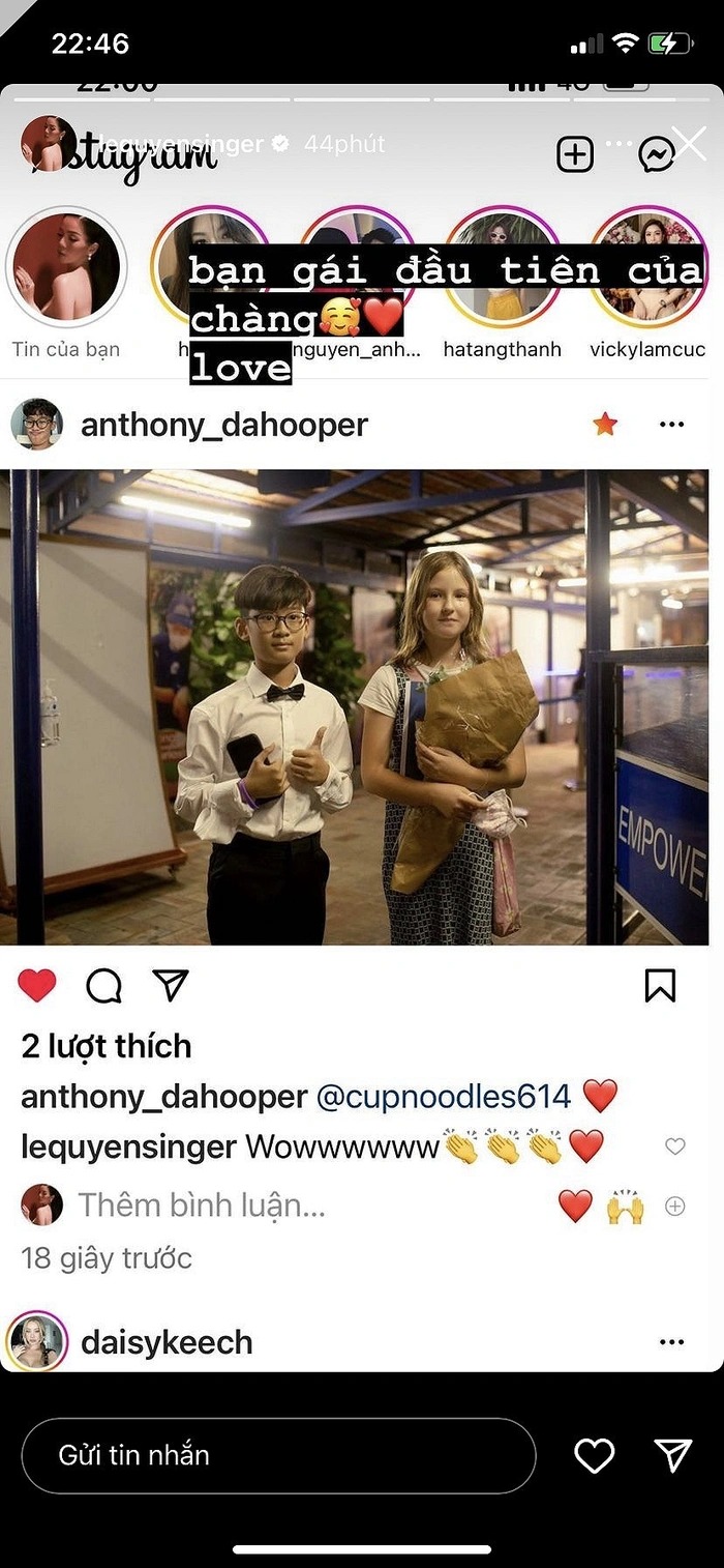 Ở tuổi 11, Bo cũng có cuộc sống trưởng thành và vô cùng sung túc, thoải mái. Tháng 6 vừa qua, cậu bé khoe đã có bạn gái là người ngoại quốc, học cùng trường. Lệ Quyên rất ủng hộ chuyện tình cảm của con. Nữ ca sĩ chia sẻ lại bức ảnh con chụp cùng bạn gái và bày tỏ: "Bạn gái đầu tiên của chàng. Yêu con".