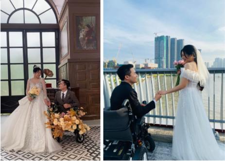 Chàng trai Tô Đình Khánh đã ghi lại khoảnh khắc trong quá trình thực hiện bộ ảnh cưới cùng vợ và nhận được nhiều sự chú ý từ cộng đồng mạng. Theo đó, chàng trai diện vest bảnh bao, ngồi trên chiếc xe lăn thường ngày nhưng có được trang trí đặc biệt hơn. Trên tay, Đình Khánh cầm một bó hoa, gương mặt rạng rỡ khi nhìn thấy cô dâu của đời mình.