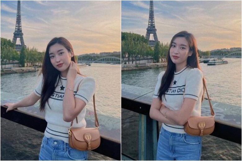 Trong chuyến du hí trời Âu mới đây, nàng Hậu diện thiết kế đơn giản nhưng mang nét cổ điển của nhà mốt bản địa Christian Dior, Đỗ Mỹ Linh đã diện thiết kế dệt kim tay ngắn in tên hãng đang được nhiều tín đồ thời trang yêu thích. Giá bán của mẫu áo này là 62 triệu đồng