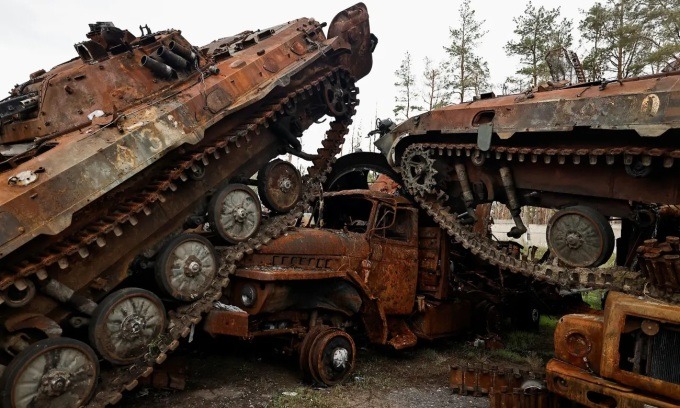 Xe tăng Nga và xe quân sự bị phá hủy ở thành phố Lyman, vùng Donetsk, miền đông Ukraine hôm 5/10. Ảnh: Reuters.
