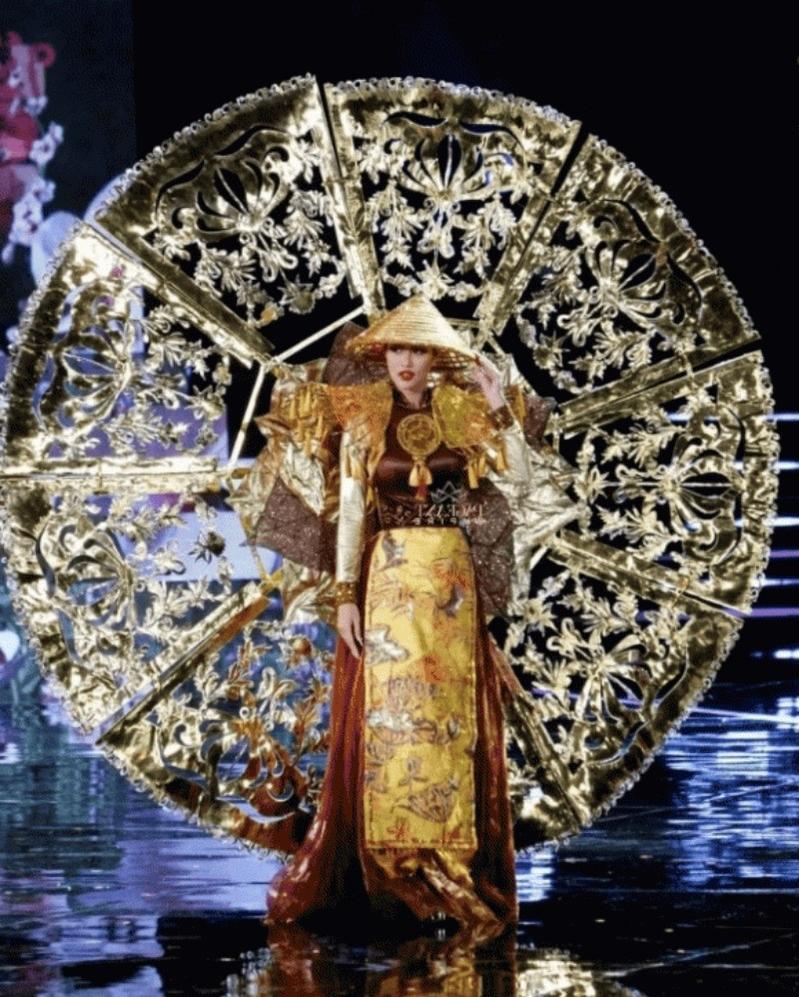 Trong đêm diễn trang phục dân tộc tối 20/10, Hoa hậu Đoàn Thiên Ân đã tỏa sáng với trang phục dân tộc mang tên 'Trúc chỉ', được lấy cảm hứng từ dòng tranh nghệ thuật xứ Huế. Dù kĩ năng trình diễn rất chuyên nghiệp nhưng do trang phục nặng và cồng kềnh nên ở những giây cuối, cô phải dùng tay để xoay phần cánh trông hơi vụng về.