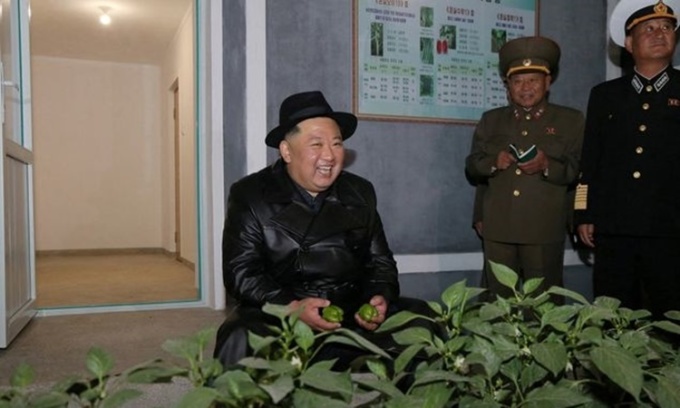 Ông Kim Jong-un thị sát một trang trại nhà kính hồi đầu tháng. Ảnh: KCNA.