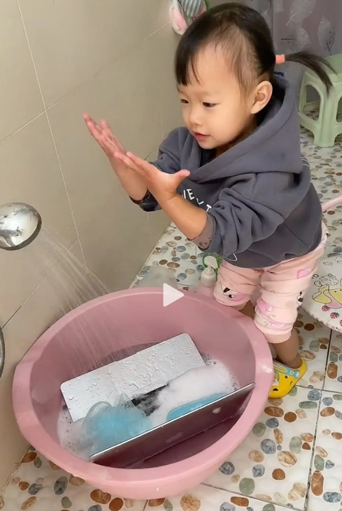 Đoạn video do người mẹ ở Sơn Đông ghi lại cho thấy chiếc laptop thương hiệu Apple nằm gọn trong chậu rửa đầy nước và bọt xà phòng trắng xóa. Trong khi đó, một quả bông tắm màu xanh nằm trên bàn phím. Trong video, bé gái, có nickname Duomi, vặn vòi cho nước chảy ra rồi dùng hai tay vốc nước trong chậu lên xem sạch hay chưa.