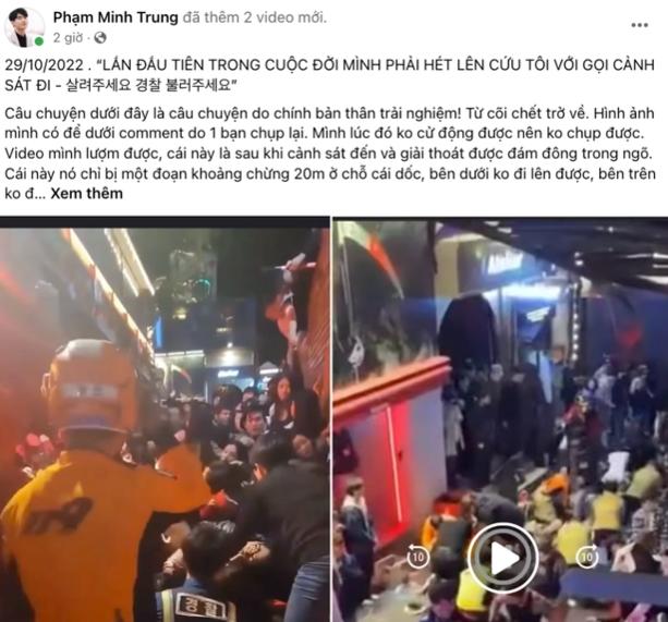 Minh Trung cũng cho biết thời điểm diễn ra vụ việc đáng tiếc tại khu vực sầm uất bậc nhất Seoul này: “Mình đến đó tầm 9 giờ 15 tối, khoảng 9 giờ 40 thì bắt đầu xảy ra hỗn loạn. Vật vã một hồi lâu như cả thế kỷ thì đến 10 giờ 30 cảnh sát nhận được tin báo đến hiện trường. Mất tầm 15 đến 20 phút thì giải thoát được mọi người thiếu không khí tại chỗ dốc định mệnh đó”.