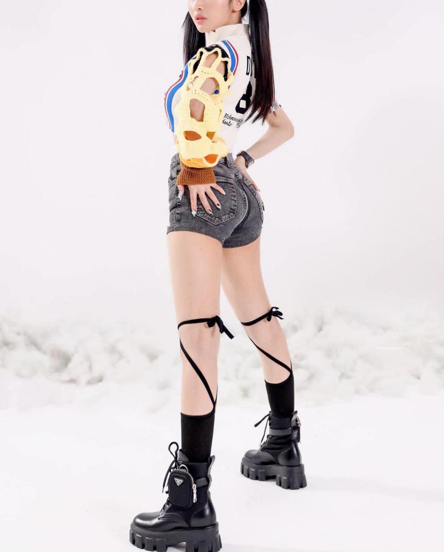 Cô lăng xê thành công chiếc quần "tội đồ đường phố". Cô kết hợp áo croptop với quần ngắn, đi boots cổ thấp hầm hố tạo nên tổng thể ấn tượng.