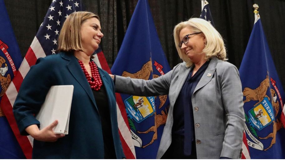 Bà Liz Cheney cùng nghị sĩ đảng Dân chủ Elissa Slotkin tại Michigan hôm 1/11. Ảnh: Reuters.