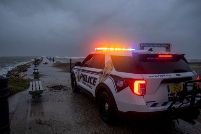 Xe cảnh sát chặn lối ra bãi biển ở công viên Inlet, thành phố Fort Pierce trước khi bão Nicole đổ bộ (Ảnh: Reuters).