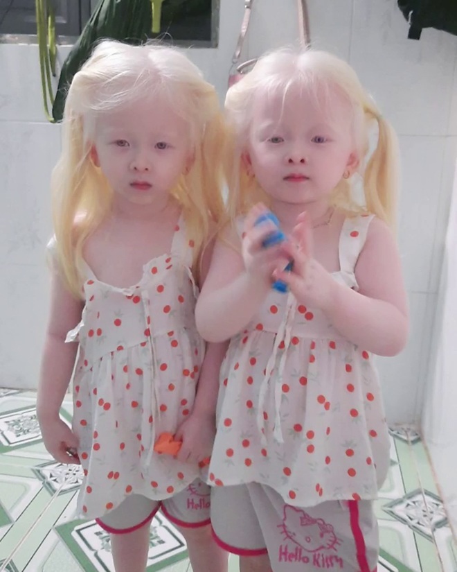 Một cặp song sinh nữ vô cùng đáng yêu và lạ kỳ: Sở hữu làn da trắng muốt, mái tóc dài – dày màu trắng và đôi mắt màu xanh lá. Ai nhìn thoáng qua cũng ngỡ hai bé là… con lai nhưng càng nhìn càng thấy đậm chất người Việt Nam.