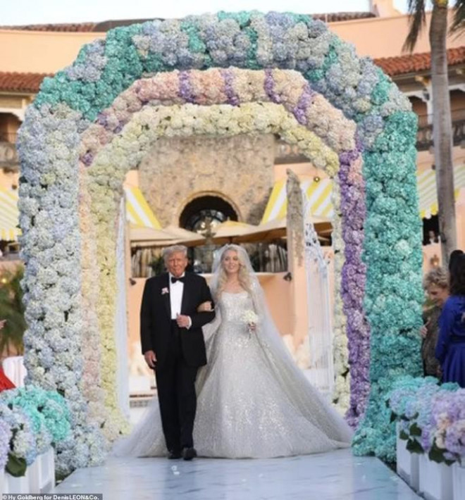 Theo như con gái út Tifffany Trump của cựu tổng thống thứ 45 nước Mỹ trông lộng lẫy trong chiếc váy dài tay ánh kim, mái tóc vàng được tạo kiểu sóng mượt và cài hoa tai bằng kim cương, khiến ông Donald Trump đích thân dắt tay con gái Tifffany Trump vào lễ đường trao cho chàng rể tỉ phú Michael Boulos trong lễ cưới tráng lệ tối 12-11 (giờ Mỹ) vừa qua.