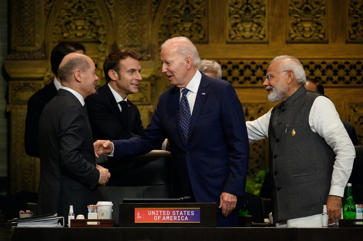 Tổng thống Pháp Emmanuel Macron bắt tay Thủ tướng Ấn Độ Narendra Modi trong hội nghị thượng đỉnh G20 ở Bali, Indonesia.