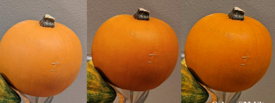Hình ảnh được chụp là một quả bí ngô. Kết quả cho thấy, ảnh chụp bởi Galaxy S23 Ultra được xử lý theo phong cách của Samsung với màu sắc bão hòa hơn. Tuy nhiên, kết cấu của quả bí ngô sắc nét hơn so với ảnh chụp từ chiếc flagship Galaxy S22 Ultra 2022 và vượt qua smartphone cao cấp của Google.