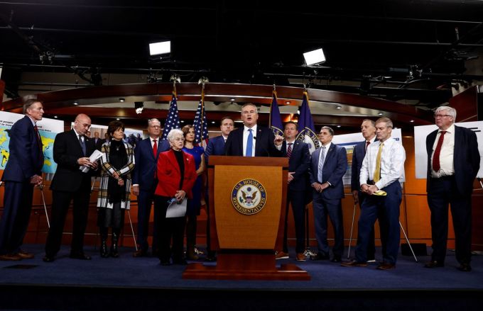 Nghị sĩ James Comer (giữa) cùng các nghị sĩ Cộng ḥa tại Hạ viện trong cuộc họp báo ở ṭa nhà quốc hội ngày 17/11. Ảnh: Reuters.