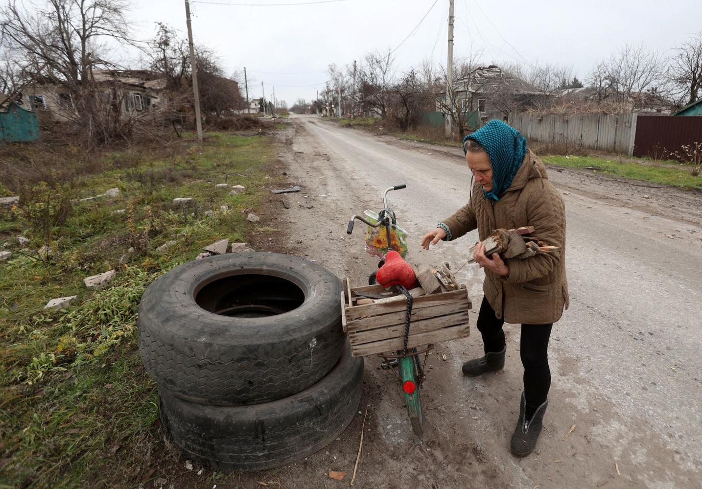 Một người dân đi mót củi ở gần thị trấn Lyman, Ukraine. (Hình minh họa: Anatolii Stepanov/AFP via Getty Images)