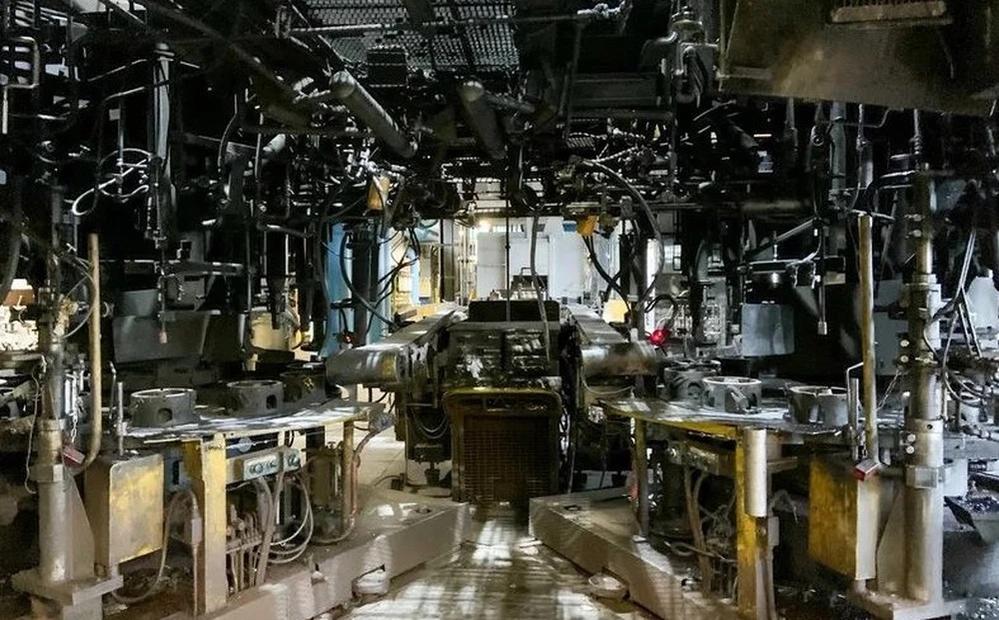 Dây chuyền lắp ráp tại nhà máy sản xuất đồ thủy tinh Duralex không hoạt động, các thiết bị công nghiệp khổng lồ đang nằm im ĺm trong bóng tối tĩnh lặng.