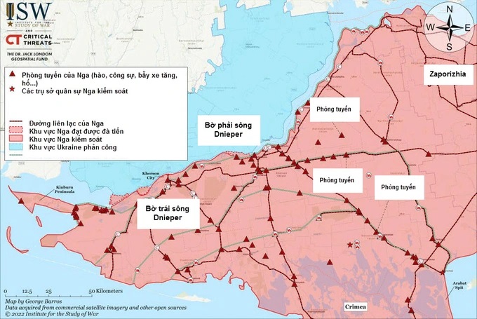 Theo ISW, các chiến tuyến Nga xây dựng chưa đủ dài để có thể chặn đà tiến của Ukraine nếu Kiev vượt thành công sang bờ trái sông Dnieper.