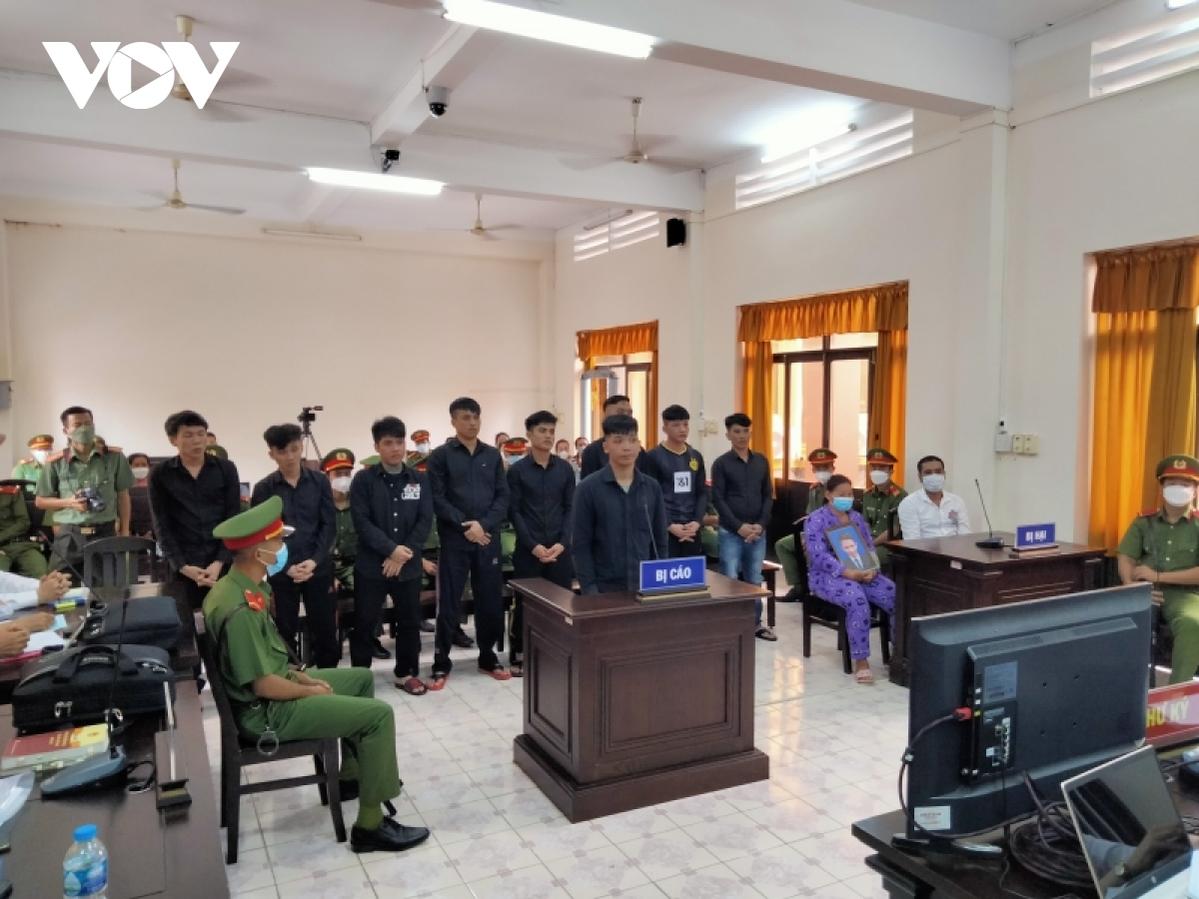 Các bị cáo bị tuyên án với hai tội danh giết người và bắt giữ người trái pháp luật gồm Chung Tấn Tuấn (27 tuổi), ngụ huyện Giồng Riềng (Kiên Giang) 24 năm tù; Trần Văn Nam (30 tuổi), ngụ TP. Rạch Giá (Kiên Giang) 21 năm tù; Liêu Hoàng Tuấn (25 tuổi), ngụ TP. Rạch Giá 19 năm tù; Danh Luận (26 tuổi), ngụ huyện Châu Thành (Kiên Giang) 20 năm tù; Danh Bé An (26 tuổi), ngụ TP. Rạch Giá 20 năm tù; Trần Khánh Việt (28 tuổi), ngụ TP. Rạch Giá 19 năm tù; Trần Văn Thảnh (31 tuổi), ngụ TP. Rạch Giá 19 năm tù về. Riêng Trần Tuấn Thanh (29 tuổi), ngụ TP. Cần Thơ và Trần Văn Tài (33 tuổi), ngụ TP. Rạch Giá cùng mức án 16 năm tù về tội giết người.