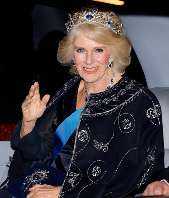 Bà tô điểm diện mạo bằng bông tai và vòng cổ đồng điệu - món quà cưới mà Nữ hoàng Elizabeth II nhận từ cha của bà, Vua George VI. Camilla cũng đeo loạt trang sức đó trong bữa tiệc chiêu đãi cấp nhà nước vào tháng trước, nhưng lần này bà bổ sung viên sapphire cỡ lớn có thể tháo rời của vòng cổ.