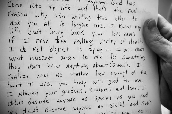 Một trong những lá thư Carter gửi gia đình nạn nhân trước khi bị thi hành án, xin tha thứ và thú nhận Anthony vô tội, hoàn toàn không liên quan vụ án. Ảnh: Texas Monthly