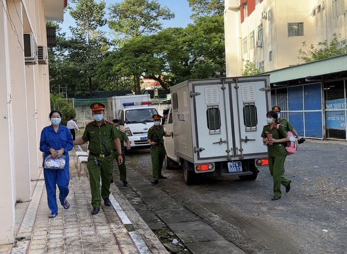 Bị cáo Nguyễn Thị Kim Hạnh (tức Mười Tường) cầm bọc thuốc khi bị dẫn giải đến tòa.