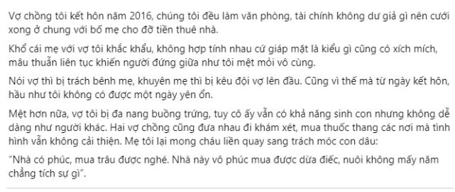 Mệt hơn nữa, vợ tôi bị đa nang buồng trứng, tuy cô ấy vẫn có khả năng sinh con nhưng không dễ dàng như người khác. Hai vợ chồng cũng đưa nhau đi khám xét, mua thuốc thang các nơi mà tình hình vẫn không cải thiện. Mẹ tôi lại mong cháu liền quay sang trách móc con dâu: