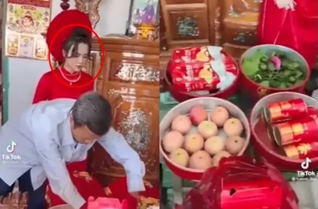 Mới đây, trên mạng xuất hiện một buổi lễ trước đám cưới của một gia đình. Đáng nói, trong đoạn video, gương mặt của cô dâu có vẻ thất thần khi nhìn từng tráp được mở ra.