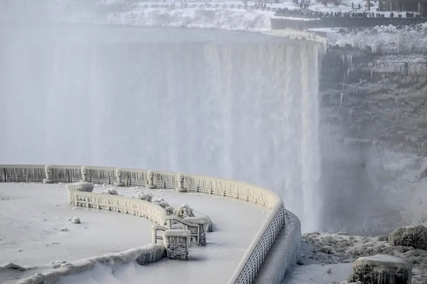 Thác Niagara ở bang New York bị đóng băng một phần trong đợt bão tuyết lạnh giá, tạo cảnh tượng đẹp như chỉ có trong cổ tích.